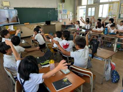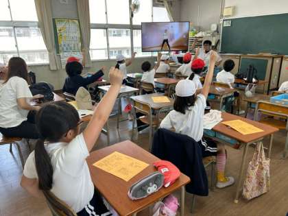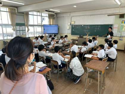 3年、4年の運動会の学びや5年生の算数を見学されました。1年生は運動場で運動会に向けて学んでいました。