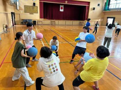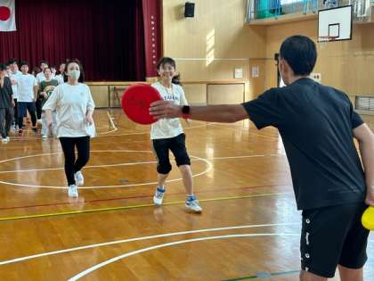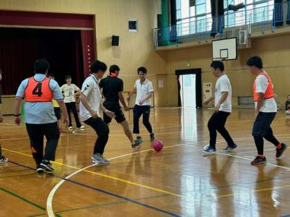 準備運動では走るを基本に体をほぐし、ボールを使ったゲームで競い合いながら、声のない学びの場を楽しみました。