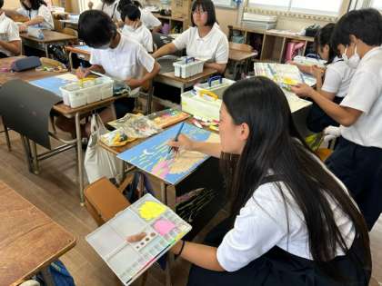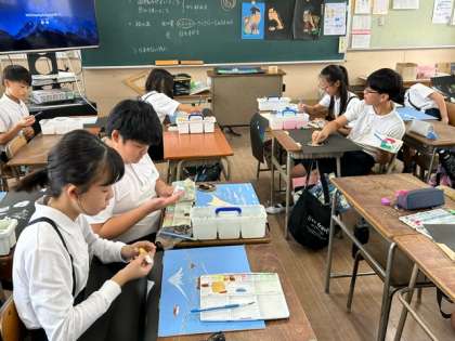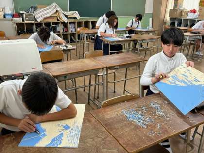 細かい部分を丁寧に色付けして、一回一回、貼り付けて色を作り出します。バレンを使って、慎重にかつ大胆に押し付ける作業を続けます。