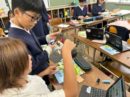 キルトをつかって、自分がつくりたいキャラクターをイメージしています。タブレットから情報を集める子どもや、手際よく作りたいデザインを決めて、裁縫活動に入っている子どもなど、みんなの顔が楽しそうで、素敵でした。