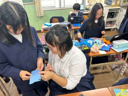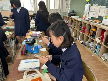 子どもたちは裁縫セットを机の上に広げて、小物づくりにチャレンジしています。