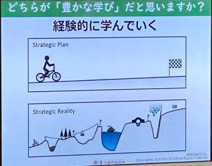 そして、2枚目のスライドにあるように、平坦な、平凡な道よりも、凸凹あり、紆余曲折あり、苦労もするけど、その分喜びもある。そんな一からつくる!みんなでつくる!学びの探究こそが、豊かな学びにつながると信じて、これからも「長原タイム」をつくっていきたいと思います。