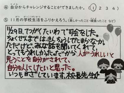 毎月末には、子どもたちは1ヶ月の学校生活を振り返ります。
