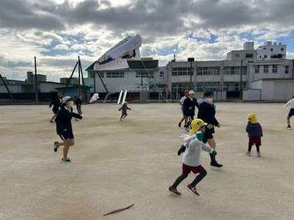 サブリーダーが近隣の幼稚園児たちと「凧上げ」を楽しみました。