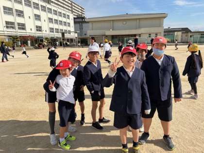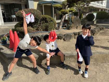 冬晴れの空の下、運動場ではそれぞれのグループが、ふえおにやしっぽ取りなどの遊びを楽しんでいます。