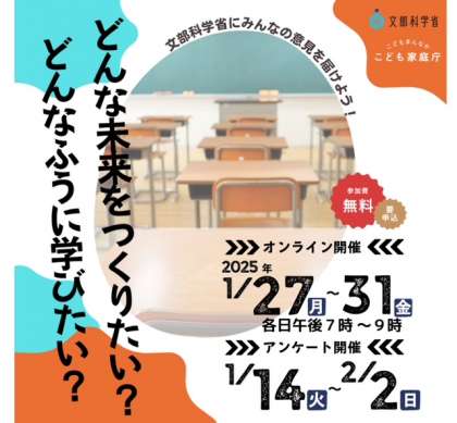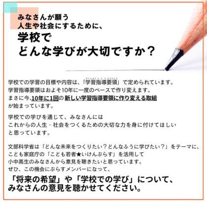学校での学習の目標や内容を定める「学習指導要領」を作り変える、10年に一度の取組が文部科学省で始まっています。この取組に活かすため、こども家庭庁の「こども若者★いけんぷらす」で小中高生年代のみなさんの意見を聴かせてください!