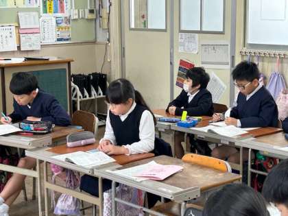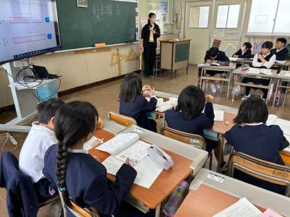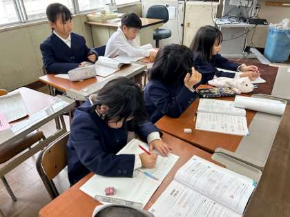 分数についての基本を学ぶ子どもたちです。机がコの字になり、お互いの顔を見合いながら、学びを進めています。