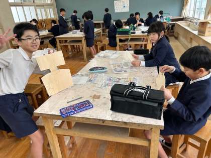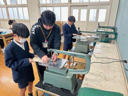 電動の糸のこの操作に四苦八苦しながらも、友だちや先生と協力しながら、作品を仕上げていきます。