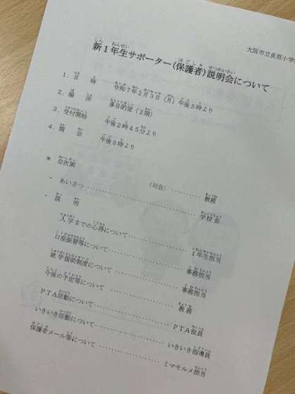 現1年担当からは、持ち物や学用品など、事務担当からは、各事務書類について、教務からは、入学式やPTAの案内、ミマモルメ担当者からの案内、最後に「いきいき活動」についてお伝えさせていただきました。