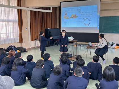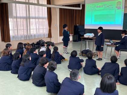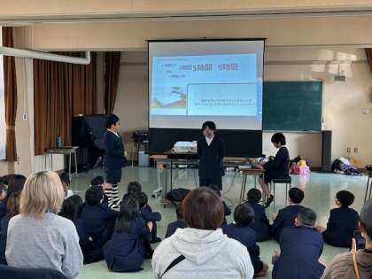 たくさんのおうちの人に見守られながら、子供たちはスクリーンに映し出される映像について、学んできたことを発表することができました。ポインターも駆使しながら、よりわかりやすく、より丁寧に伝える姿が頼もしかったです。