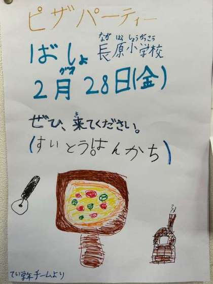 今月28日のピザパーティーに向けて123年生の子供たちは準備を頑張っています。