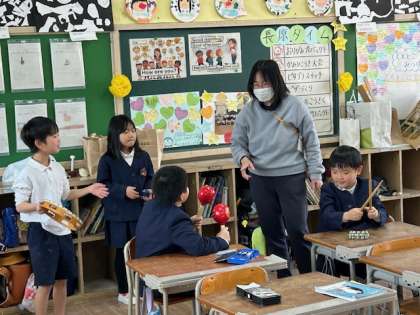 子どもたちの前にはたくさんの楽器が並んでいます。子どもたちは1人1役で楽器を担当し演奏を頑張っています。今日は個人練習に励んでいました。