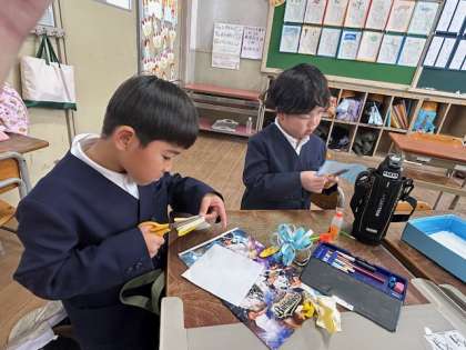 子どもたちは折り紙を上手に使って花束を作成しています。少し先になりますが、新しい1年生のために心を込めてプレゼントを作っています。