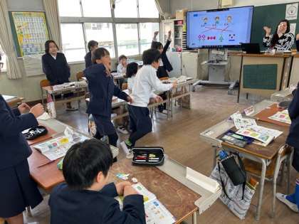 英語でクイズの答え合わせ!外国語の先生が答えを伝えるたびに子どもたちの歓声が上がります。全問正解の子どもたちにはよくがんばったシールがもらえます。