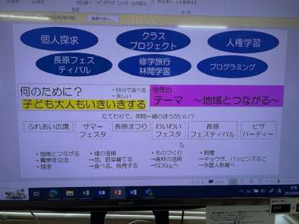 1つ目は昨年から始めた探究的学習「長原タイム」の進化についての対話です。特に、昨年度ピザパーティーでゴールを迎えた「長原フェスティバル」を今年どんなふうにつくっていくのか?一人ひとりの考えをつなぎ合わせていく作業が始まりました。