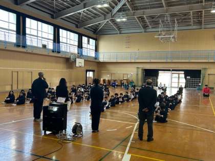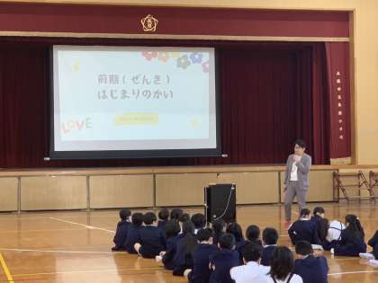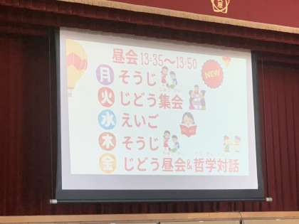 体育館では初めに新しく来られた教職員の紹介、そして私からのビジョンの共有のプレゼンテーションを行いました。どの子も真剣なまなざしで画面を見つめていました。