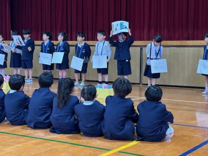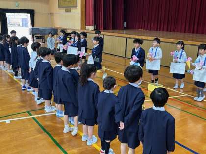 1年生の子どもたちが緊張の面持ちで入場!児童代表の言葉や2年生からの歓迎セレモニー、手作り花束の贈呈など、みんなで温かく、そして、楽しく、新しい仲間を迎えることができました。