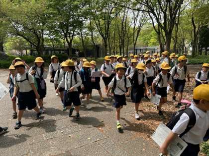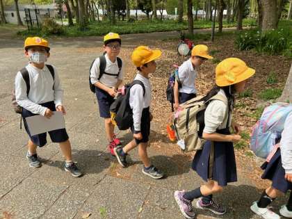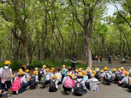 緑多い木立の中、市民の森と言われるこの場所を使って、四方八方に散らばった先生たちのポイントを目指して縦割りグループで出発しました。