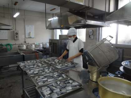 1月27日(水)魚はバットに並べて、焼き物機で焼きます。焼きあがったら、中心温度をはかります。これは火が通っているかどうかを確認するための工程で、すべてのメニューで行います。出来上がったら、食缶に配缶します。