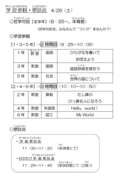 「哲学対話」「授業参観」「懇談会」を予定しています。