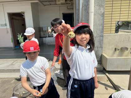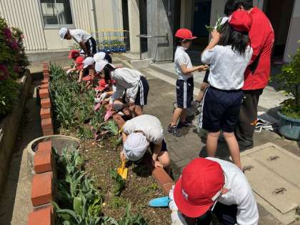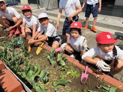 子どもたちは管理作業員室前で花を咲かせていたチューリップの球根掘りに汗を流していました。