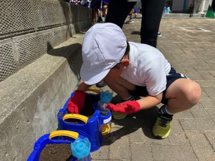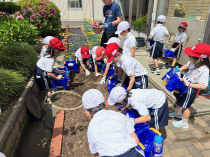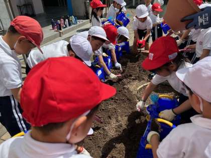 子どもたちは五月晴れの空の下、アサガオの花を育てる準備に入りました。
