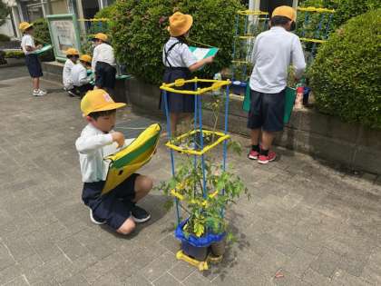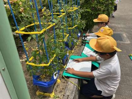 今日は外に出て、一人ひとりが育てているミニトマトの観察記録をつけています。