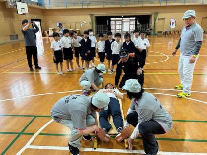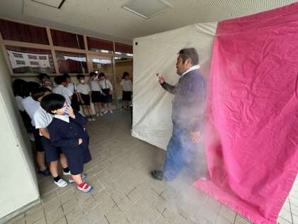 3年4年生は搬送訓練や煙ハウスを体験しました。