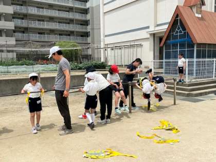 子どもたちは鉄棒にチャレンジしています。