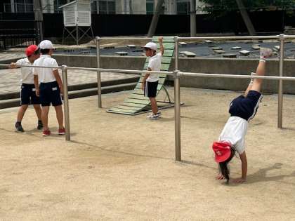 前まわりや後ろまわりなどを、もうすでにできる子もいますが、まずは低学年のうちはぶら下がったり、逆さになったり、乗ったりするなど、鉄棒と仲良くなることが大切な学びになります。