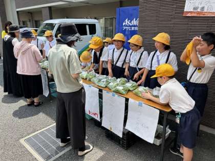 子どもたちはテーブルいっぱいに並べられた、とれたて野菜たちに値札をつけ、看板をつけ、レシートも手作りで、案内板を持って準備をしました。