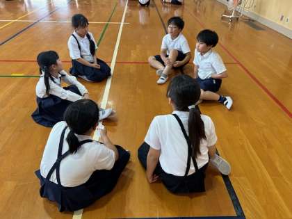 ○「哲学対話」では、異学年の集まりの中で、子どもたちも語る語る。先生たちも輪になって語る語る。