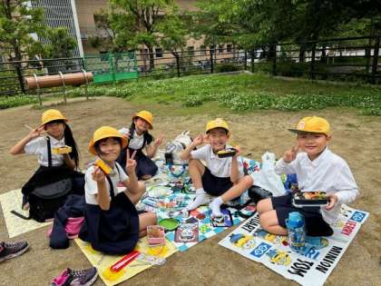 お昼は近くの広場でランチタイムです。お天気も爽やかです。気持ちの良い時間を過ごしています。