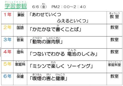 14:00〜14:40 「学習参観」(各学年で)教室&家庭科室にて