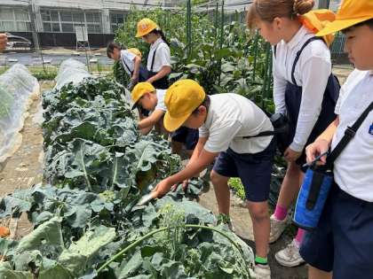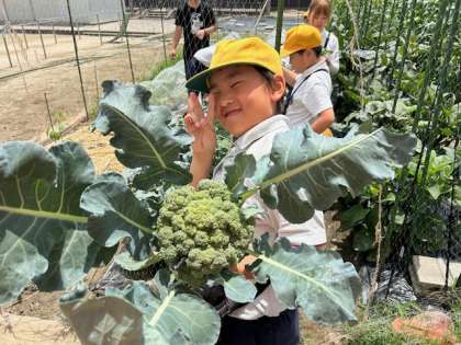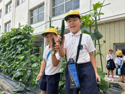 大きく育ったきゅうりが見事に成長していました。ハサミを持って丁寧に収穫する子どもたち!