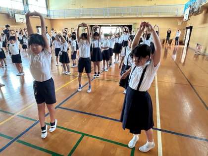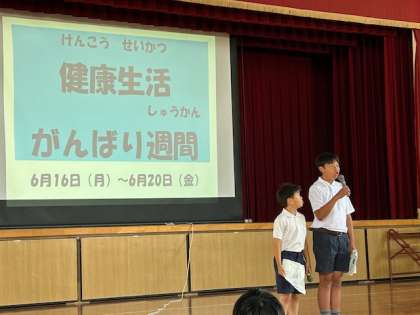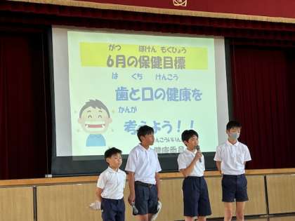 健康委員会の子どもたちが前に立ちました。マイクを握る子どもがじっと待ちます。何を待つのかというと、「空気」です!何の空気かというと、「集会を始めるための空気」です。