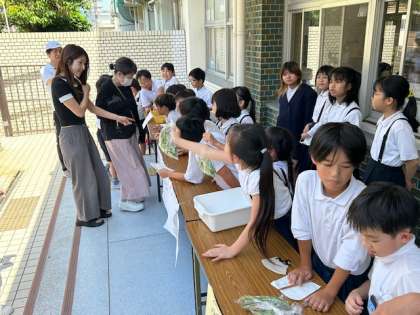 5年生の子どもがそっと2年生に寄り添って、売り方やお釣りのことやお客さんとのやりとりなどをアドバイスする姿が微笑ましくもあり、子ども同士の学び合う姿がとても素敵でした。