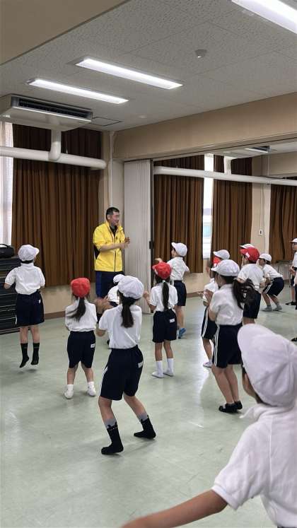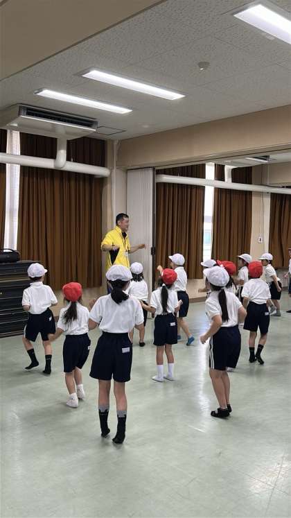 ゲストに教頭先生を招いて、体育のプロから、踊りながら準備運動する楽しさを教えてもらいました。