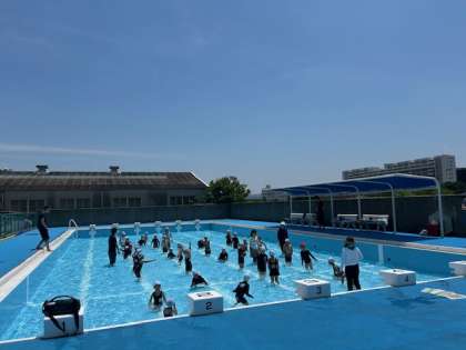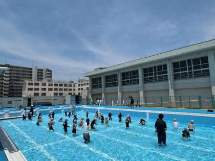 これまでのうだるような暑さから少し解放されて、日陰では風が吹くと涼しくも感じる中、1年生の子どもたちにとっては小学校でのはじめてのプールに大はしゃぎでした。
