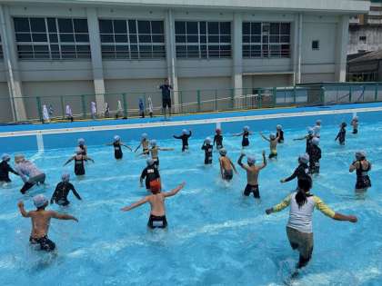 音楽に合わせて水と親しむ体操に、子どもたちは、キャッキャ言いながら楽しんでいました。