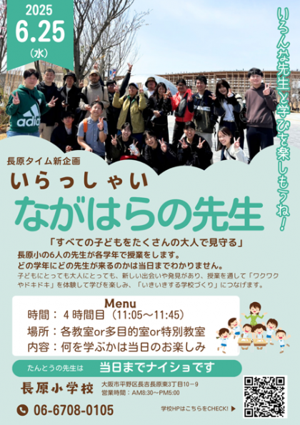 今週の水曜日!25日の4時間目は、恒例の「いらっしゃい長原の先生」です!