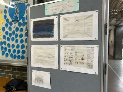 「なんだろう?」と近づいて見ると、「イラストクラブ」の子どもたちが描いた作品が並んでいました。