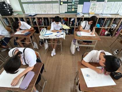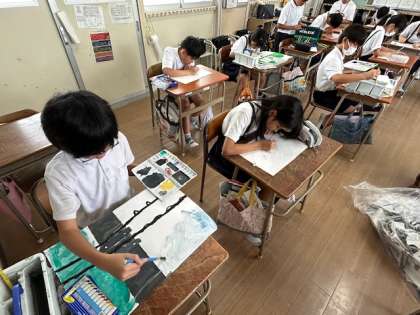 静まり返った教室の中で子どもたちが1枚の絵に向かって真剣に筆を走らせています。
