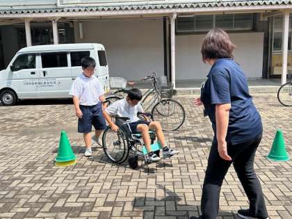校内の通路には段差や狭い場所もあり、子どもたちは「ここは通りにくいね」「自転車があると困るね」と、車椅子利用者の視点で道の工夫にも取り組みました。