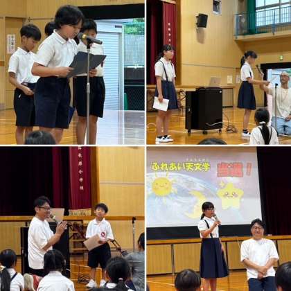 それは、「ふれあい天文学」という出前授業の当選報告でした。星のこと、太陽のこと、月のことなど、宇宙についてスペシャルゲストにお越しいただき、子どもたちと学んでもらえる特別な時間です。この企画発案者はなんと!4年生の子どもでした。2ヶ月前に校長室に来て、私に1通の手紙を差し出して、申し込みを嘆願したのです。この子どもの夢を叶えていただいた国立天文台のみなさんに感謝の気持ちでいっぱいです。実施日時が決まり次第、連絡させていただきます。