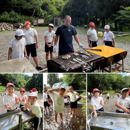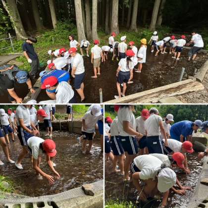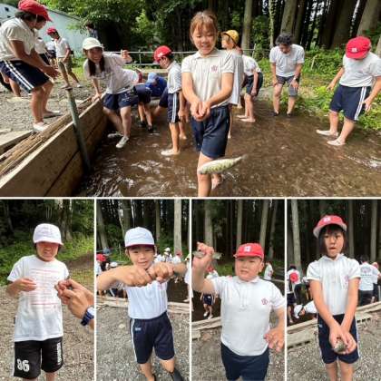 子どもたちが楽しみにしていたメインイベント「魚つかみ」が行われました。スタッフの方の丁寧な説明を聞いた後、子どもたちは冷たい川の水に元気よく飛び込んで魚との真剣勝負!
