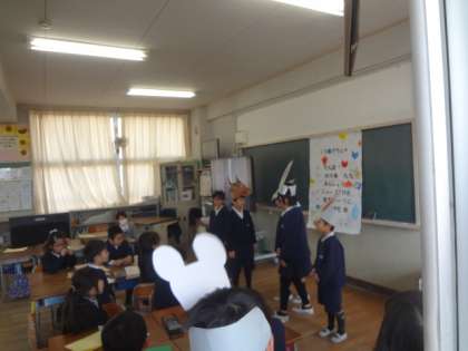 2年生は「ニャーゴ」のお話をお面をつけて発表しました。