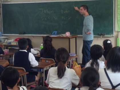 11月1日(金) 昨日はハロウィーン、そして今日は金曜日。そこで、ジェイソン先生に映画「13日の金曜日」に出てくるジェイソンに変装していただきました。また、写真は4年生の教室で自己紹介をしてもらっているところです。