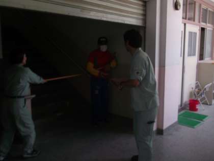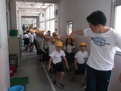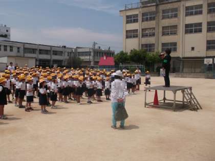 不審者を想定した避難訓練を行いました。不審者が外部から侵入して大声を出す中、「今から学級集会を行います。児童の皆さんは教室へ戻りましょう。」という校内放送で子どもたちが各教室内に避難。各担任が廊下で子どもたちを守り、“さすまた”を持った管理作業員さんたちが現場に直行—無事不審者を取り押さえました。その後運動場に移動し、警察の方から“危険な目に合わないための約束”のお話を聞きました。