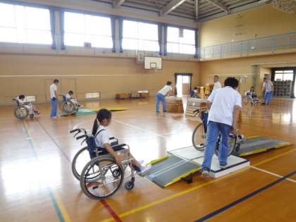 平野区リハビリテーションセンターの方々が車椅子20台(特殊車両含む)を持ってきてくださり、車イスの乗り方や、介助の仕方などについて教えてくださいました。